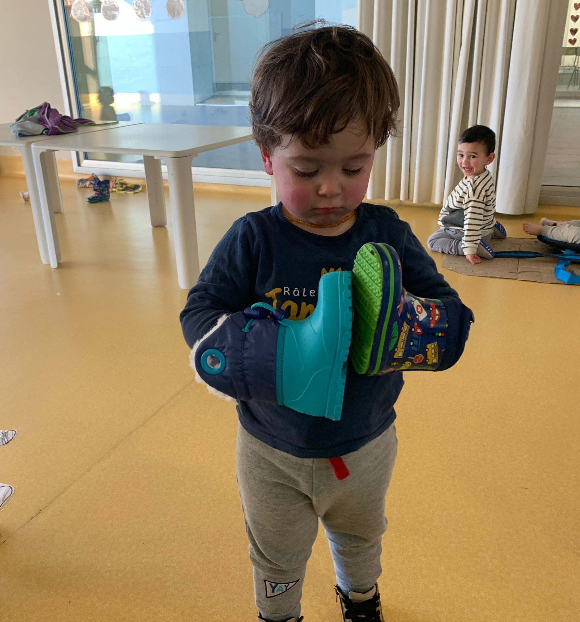 Esta semana hemos trabajado la psicomotricidad fina de una forma nueva y atractiva para los niños/as. Hemos realizado zapatos en cartón y los hemos coloreado y les hemos puesto unos cordones muy llamativos. Les ha gustado mucho desatar los cordones y meterlos en los agujeros. Además, sin darnos cuenta, hemos trabajado la coordinación óculo-manual y el movimiento pinza con nuestros dedos.