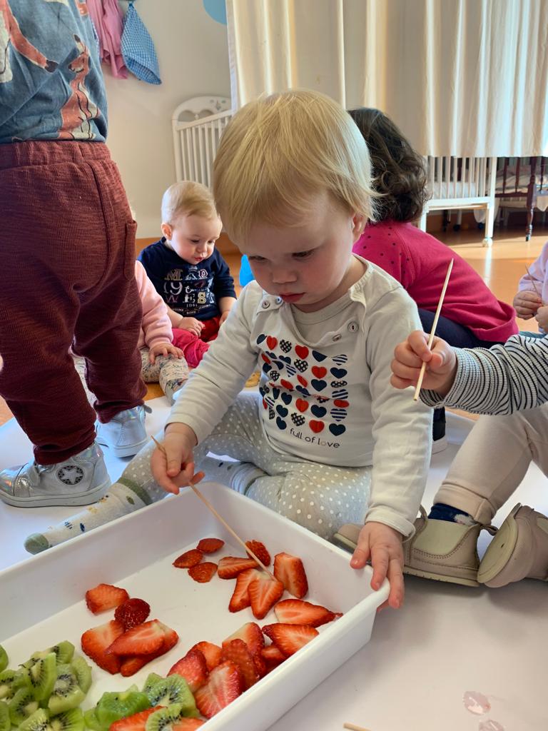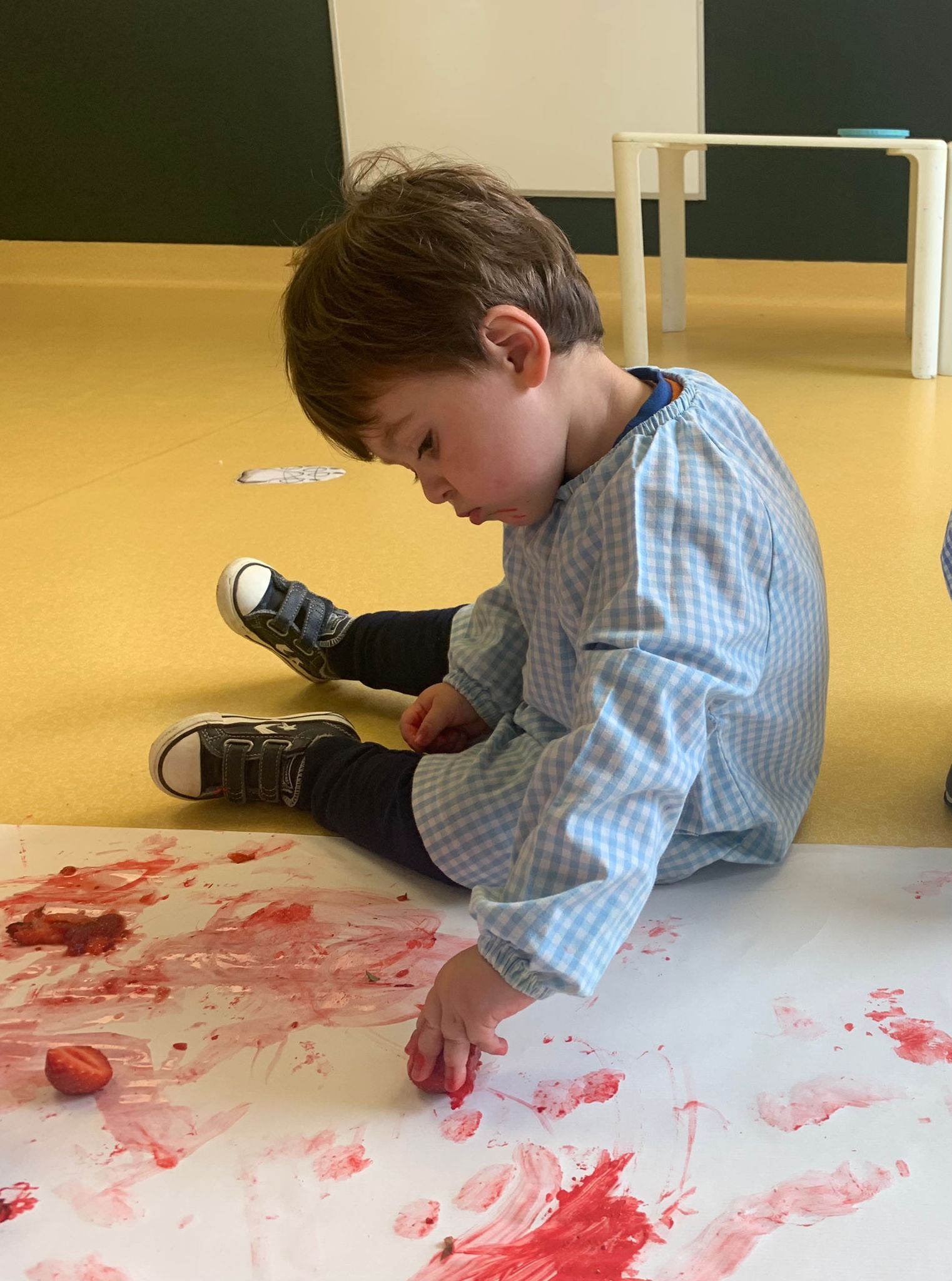 Una de las actividades de esta semana ha sido pintar con fresas sobre papel continuo. Al pintar con esta fruta, podemos observar sus posibilidades manipulativas, experimentando su textura y color, y sus posibilidades gustativas, al saborearlas y olerlas. Del mismo modo, favorece su imaginación y creatividad utilizando este recurso como medio de expresión e interacción creando un bonito mural cooperativo.