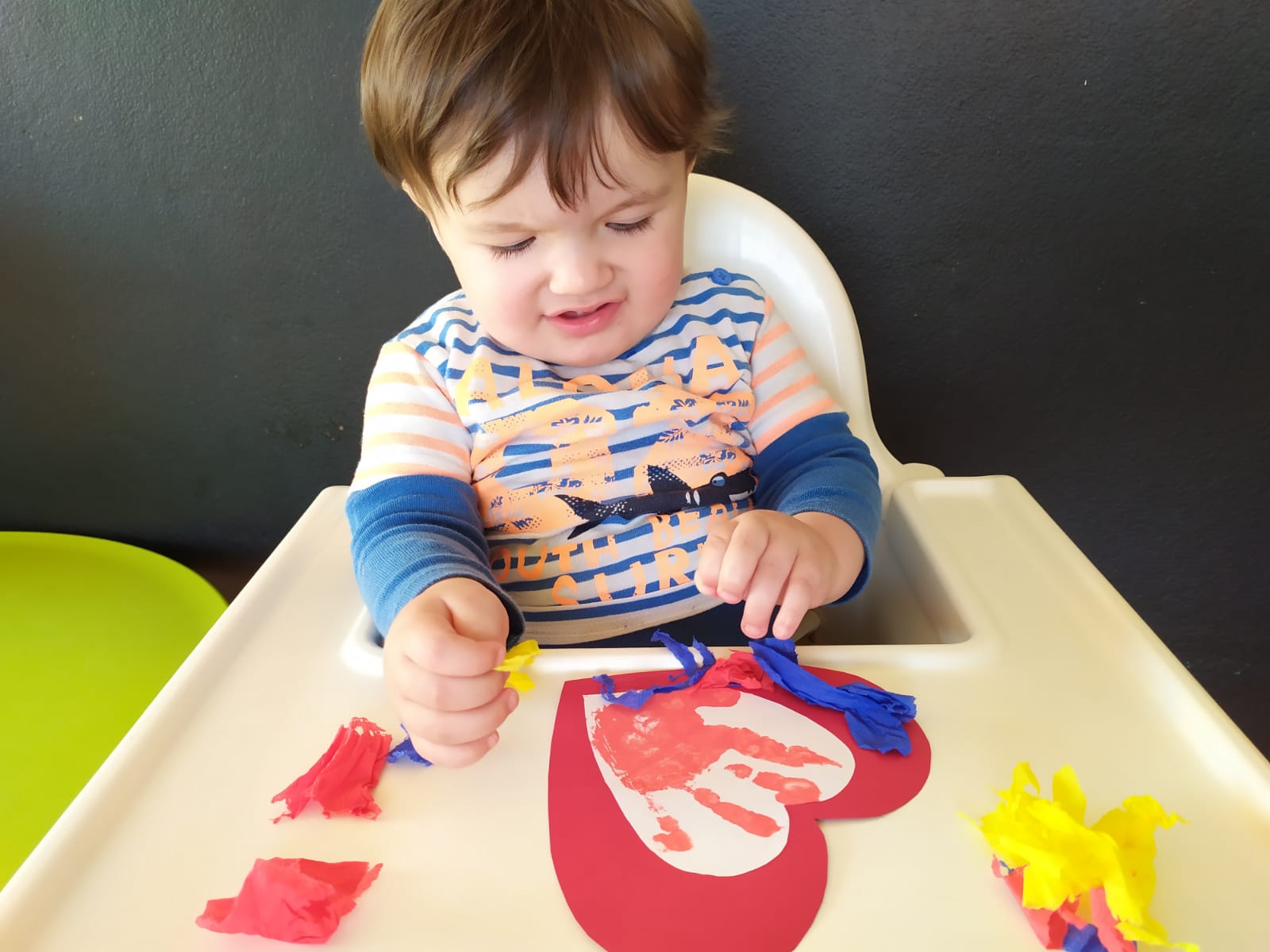 Esta semana hemos realizado una actividad muy especial. Hemos querido plasmar la huella de nuestras manos sobre un bonito corazón para todas nuestras mamás. Después lo hemos decorado rasgando papel de seda, trabajando a su vez nuestra motricidad fina, los colores y las texturas.