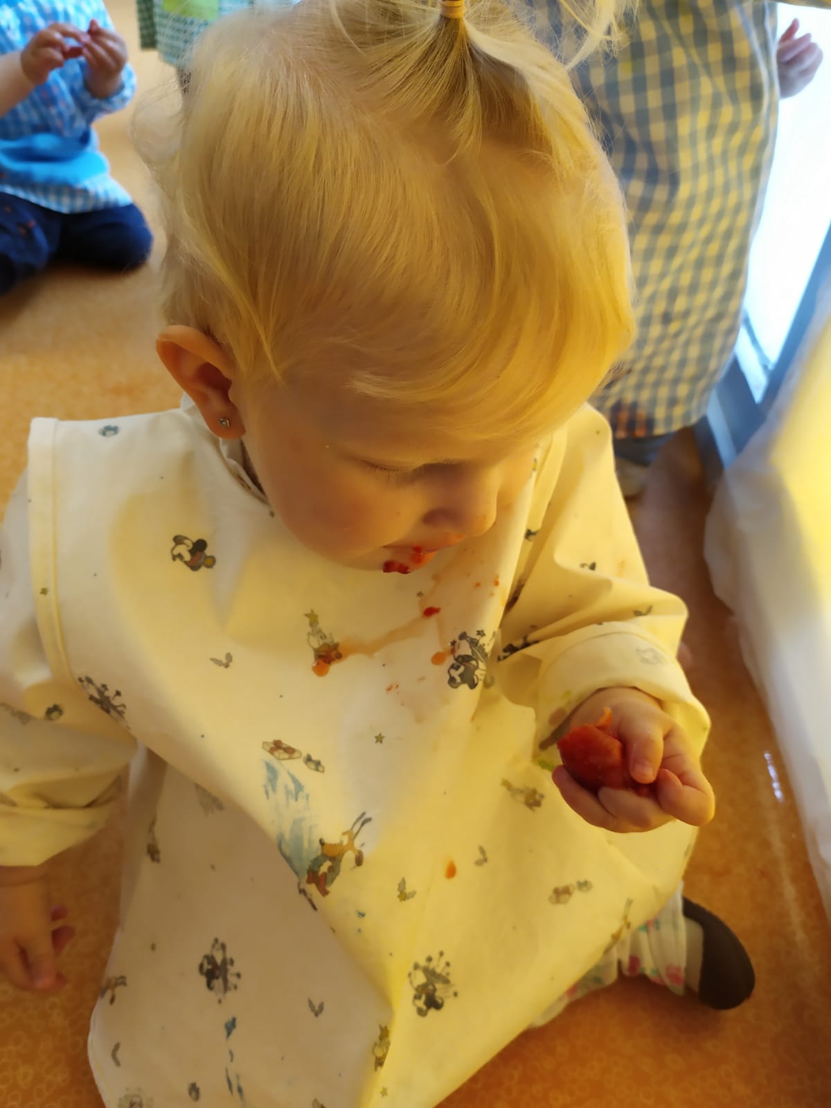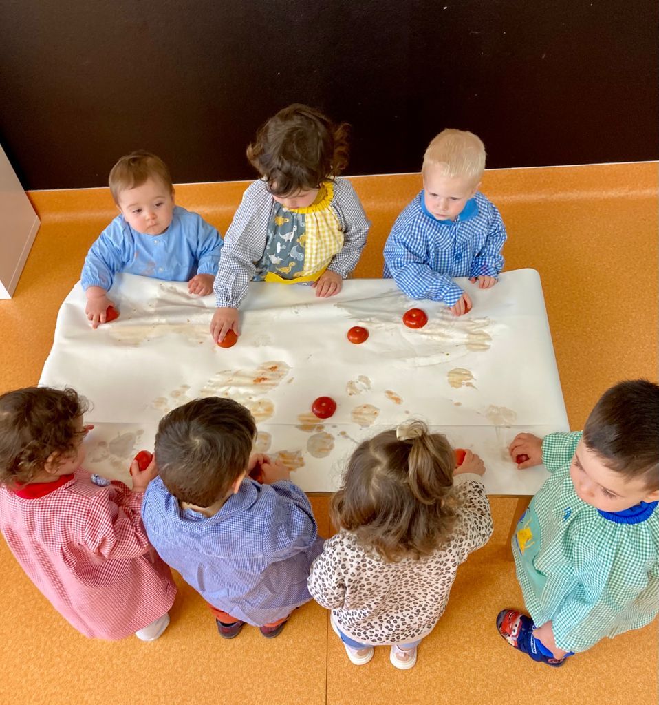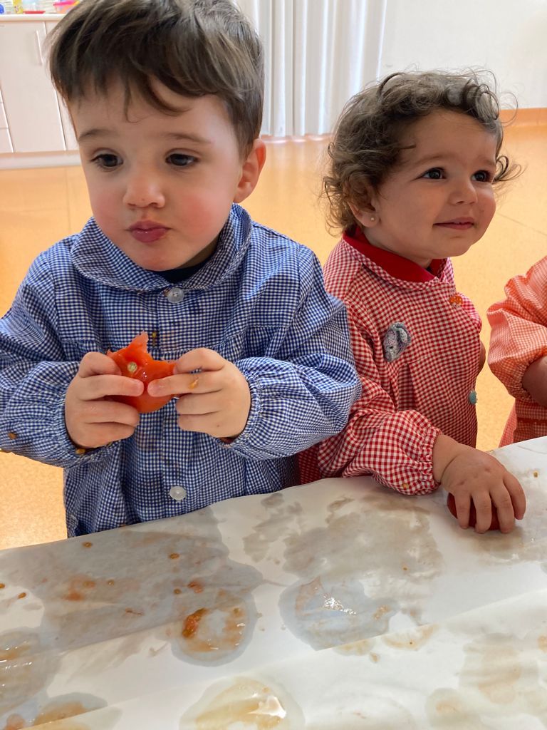 Como nos divertimos tanto pintando con zanahorias la semana pasada, esta vez hemos vuelto a desarrollar esta técnica tan llamativa para ellos, pero con tomates. Algunos han pintado, otros los han probado y también los han exprimido. Llevando a cabo este tipo de actividades podemos comprobar las diferentes reacciones que se producen en cada niño/a.