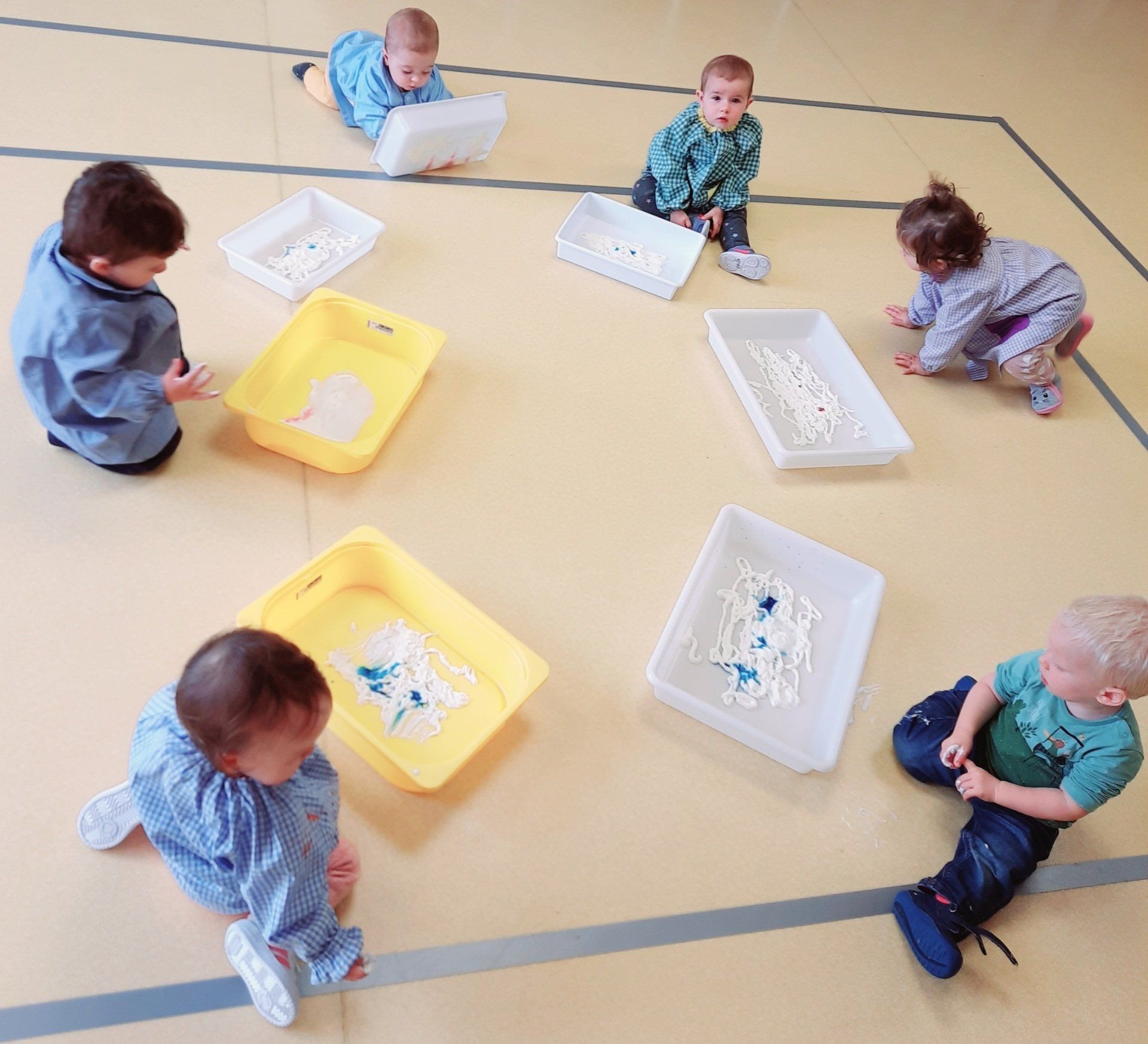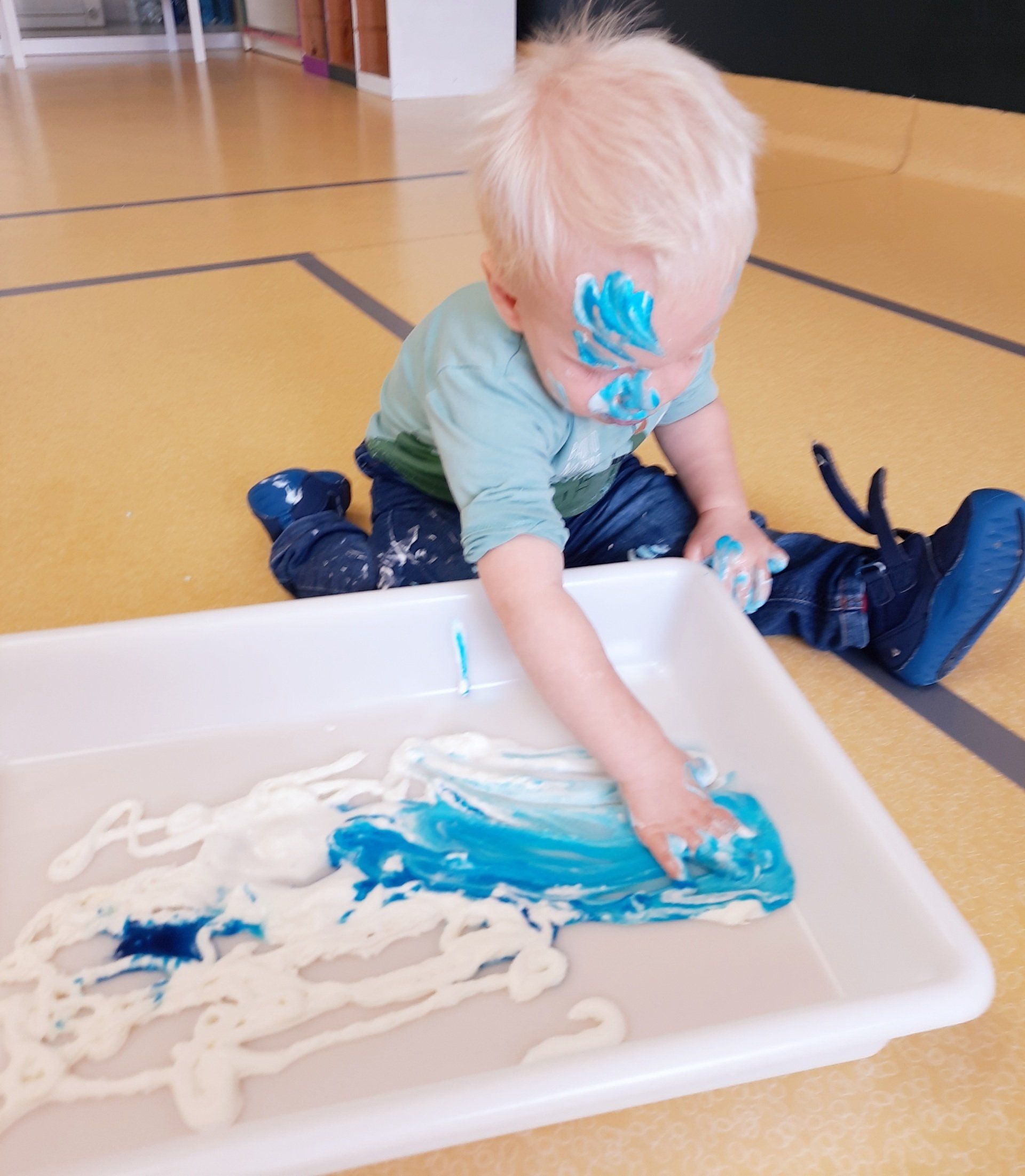Les preparamos ¡bandejas sensoriales! llenas de nata montada y colorante alimentario.