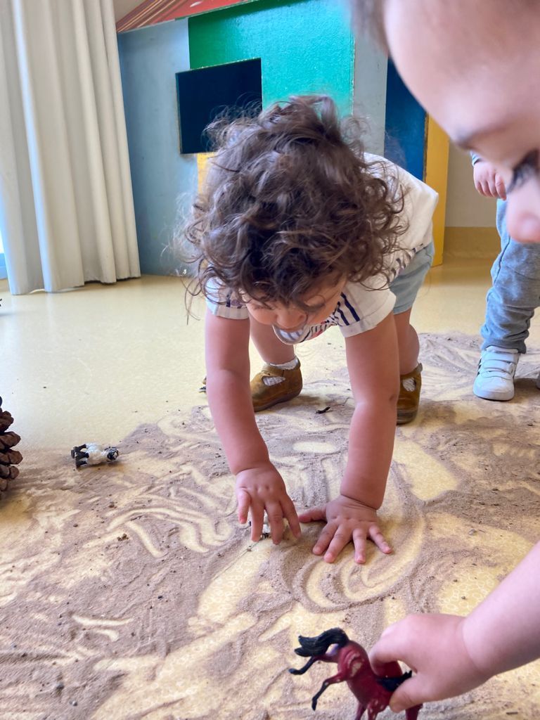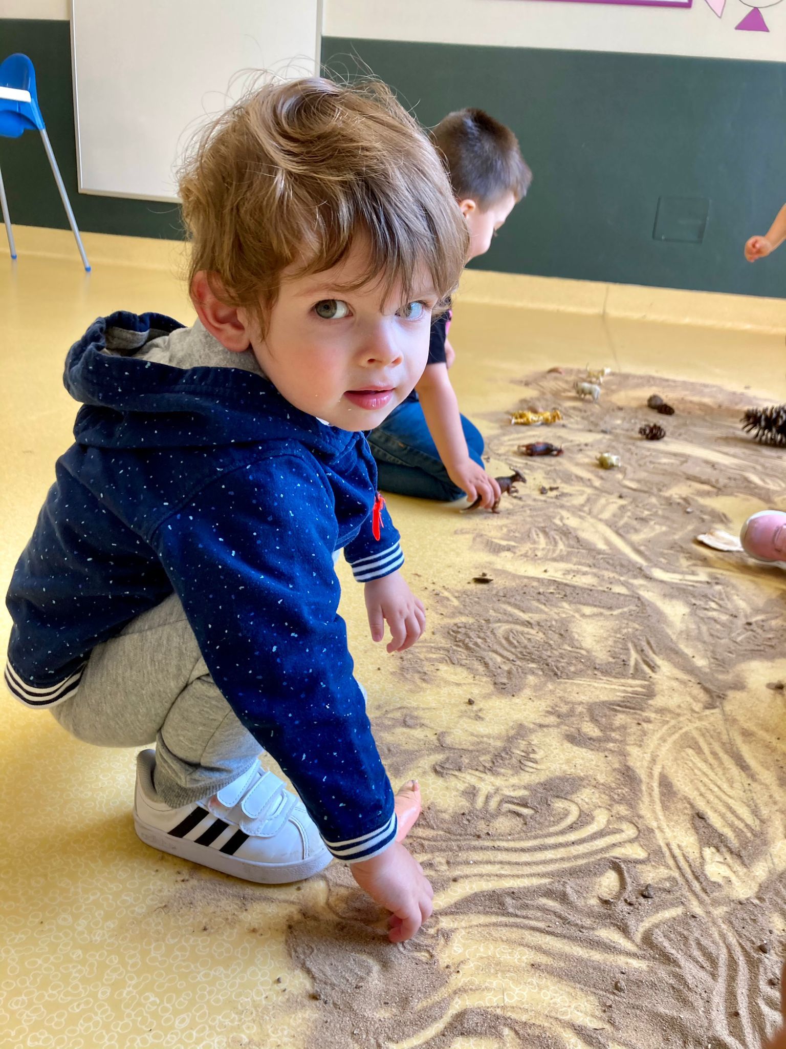 Esta semana hemos preparado una instalación con elementos de la naturaleza: arena, piñas, conchas de la playa, palos y los peques han decidido añadir a los animales a esta actividad tan motivadora y experimental para ellos.