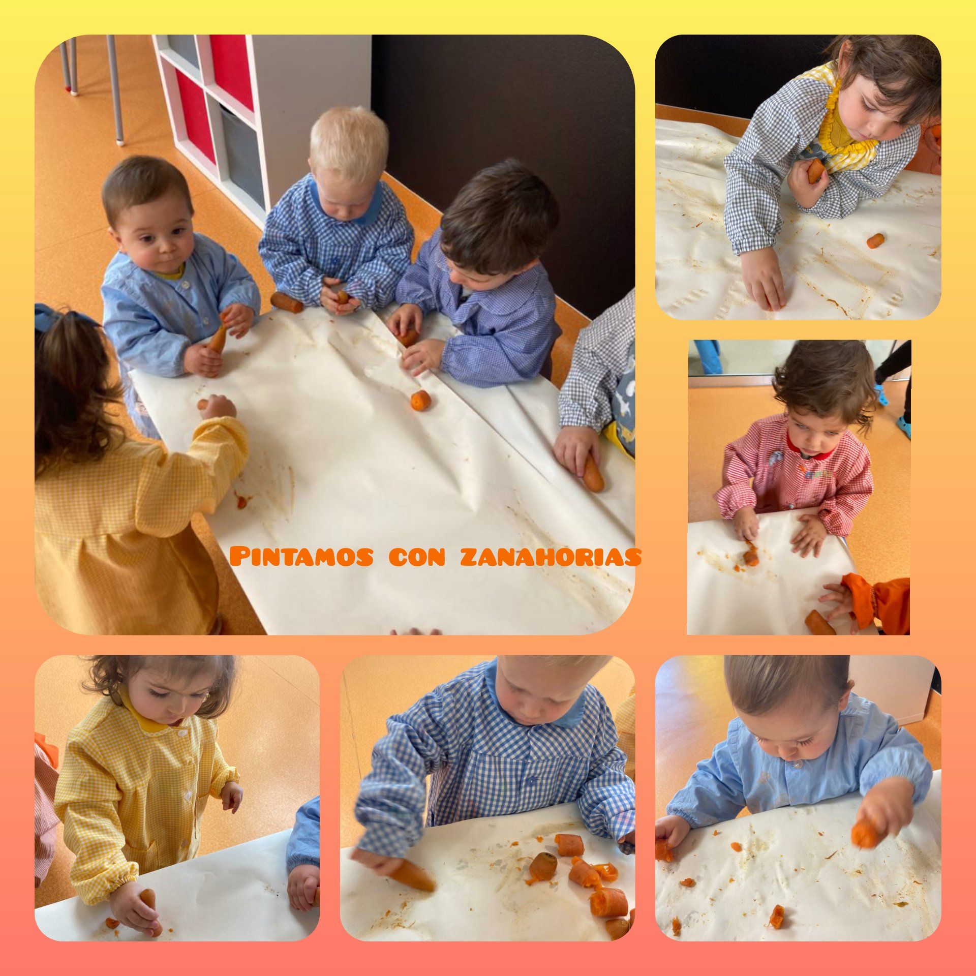 Esta semana os enseñamos un par de actividades muy entretenidas para que nos demos cuenta de la vida útil que podemos ofrecer a los materiales con los que trabajamos. En este caso comenzamos con la realización de unas bandejas sensoriales y de descubrimiento y experimentación que se basaron en buscar zanahorias en la tierra. Además de emplear esa tierra en la creación de nuestro huerto, las zanahorias fueron lavadas y cocidas para poder realizar (al día siguiente) un mural. De este modo las zanahorias se convirtieron en unos pinceles muy originales. Es muy importante poder llevar a cabo actividades con materiales naturales y reutilizables. Después de todo esto, aún quedaron zanahorias para poder disfrutarlo y conocer su sabor. Para ello, fueron peladas y partidas en tiras y a trozos. ¡Les encantó!