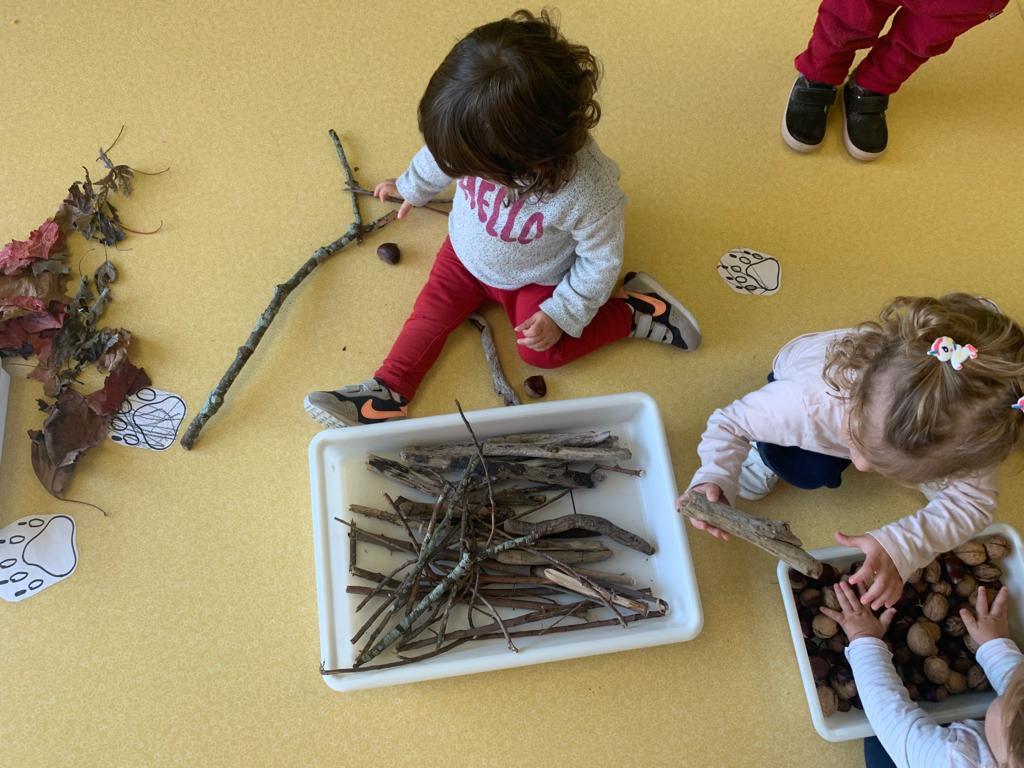 Esta semana hemos preparado una instalación con elementos de la naturaleza: arena, piñas, conchas de la playa, palos y los peques han decidido añadir a los animales a esta actividad tan motivadora y experimental para ellos.