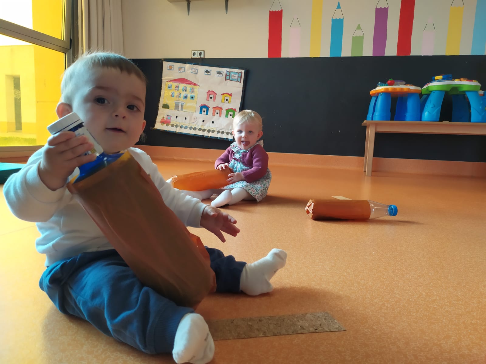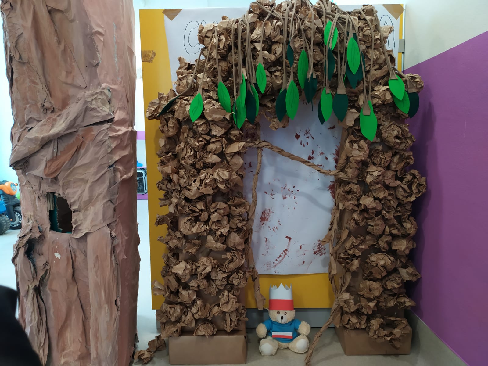 Esta semana hemos realizado una actividad con botellas recicladas, dándoles así un segundo uso educativo y lúdico a nuestros residuos. Las hemos envuelto con papel marrón y corcho simulando el tronco de los árboles y hemos podido experimentar sus propiedades como su forma, su color, su textura... además de desarrollar la motricidad fina al intentar romper y desenvolver el papel.