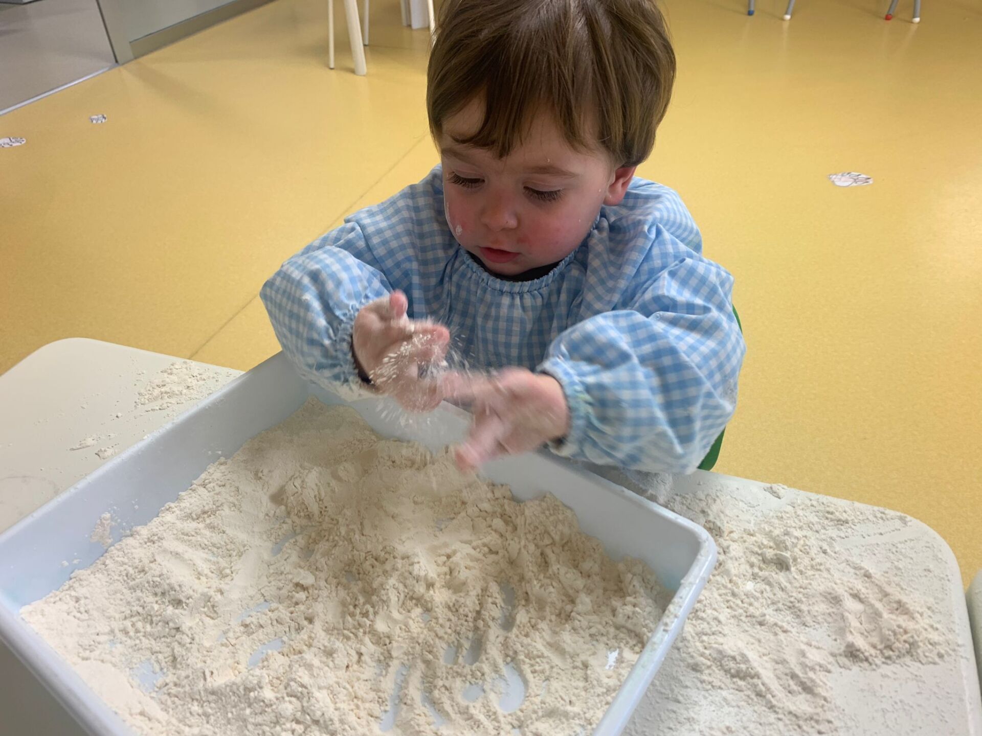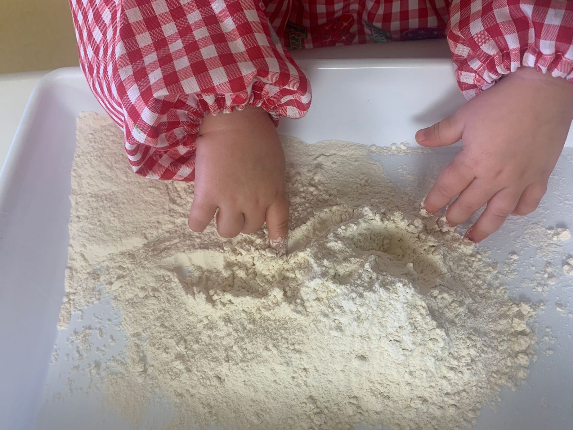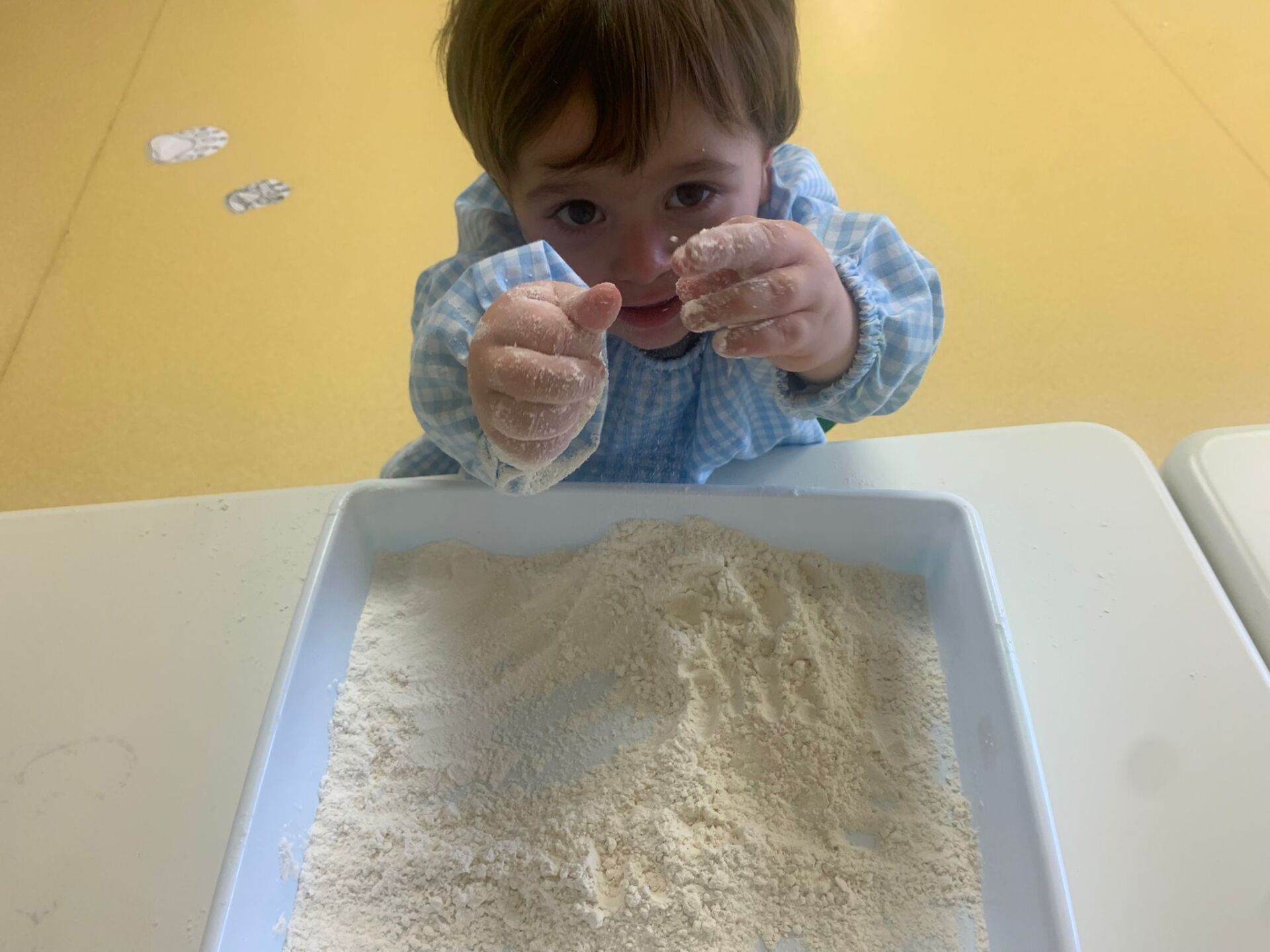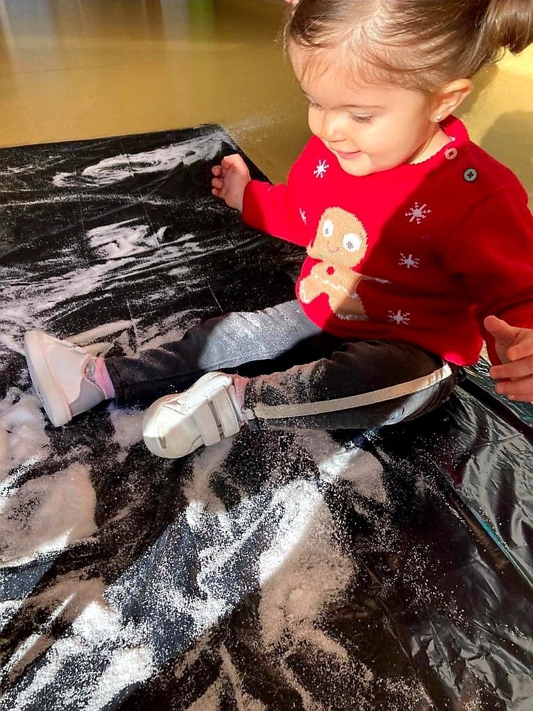 La pasada semana, nuestros peques han disfrutado de una sesión de experimentación con bandejas de harina. Os dejamos alguna foto para que veáis como han disfrutado.
