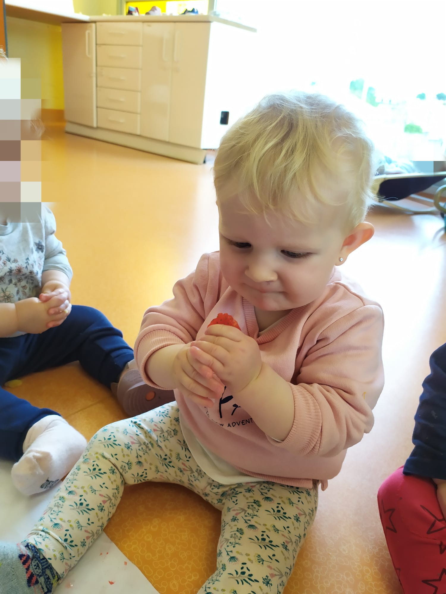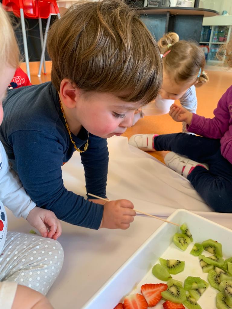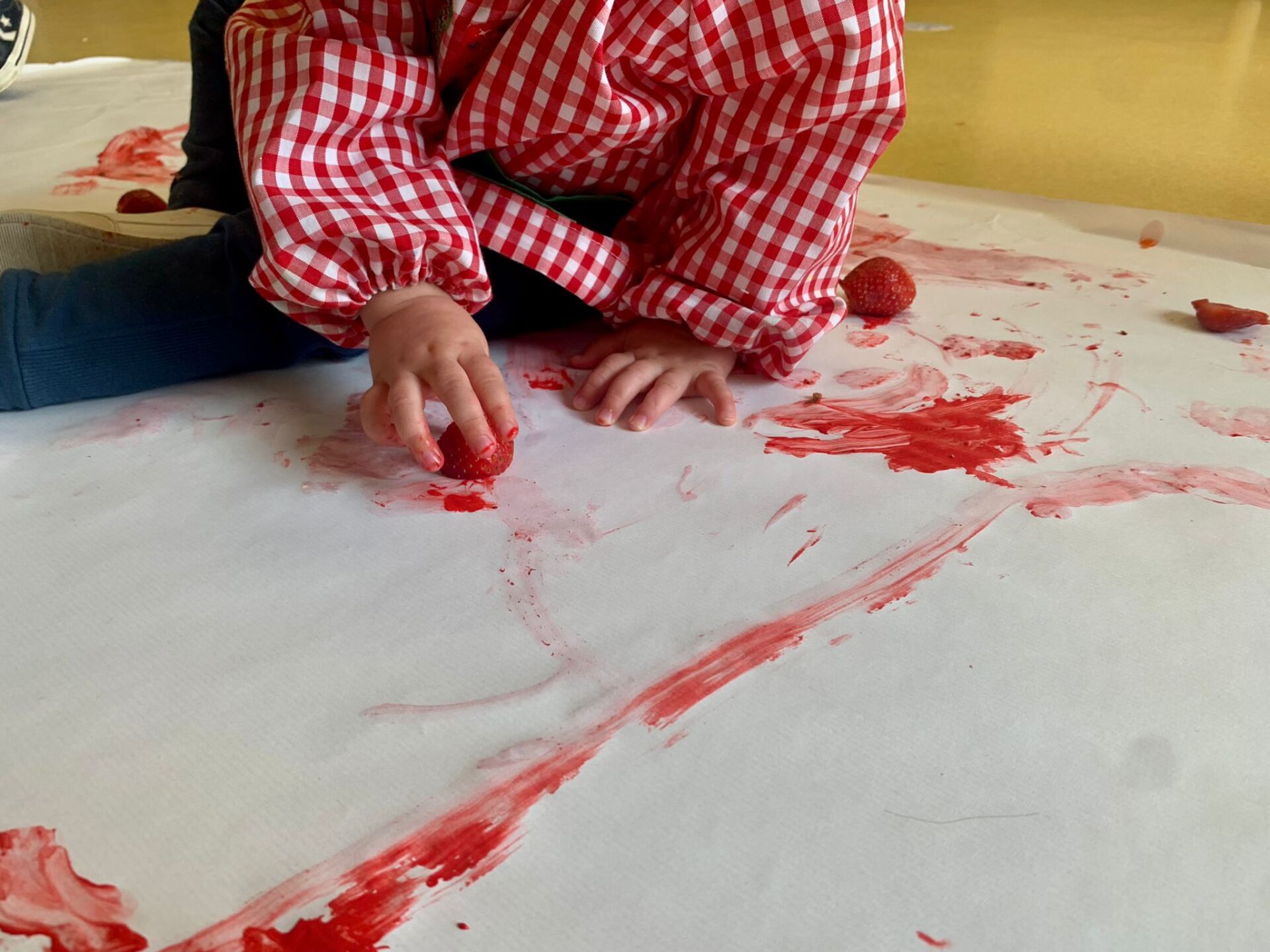 Una de las actividades de esta semana ha sido pintar con fresas sobre papel continuo. Al pintar con esta fruta, podemos observar sus posibilidades manipulativas, experimentando su textura y color, y sus posibilidades gustativas, al saborearlas y olerlas. Del mismo modo, favorece su imaginación y creatividad utilizando este recurso como medio de expresión e interacción creando un bonito mural cooperativo.