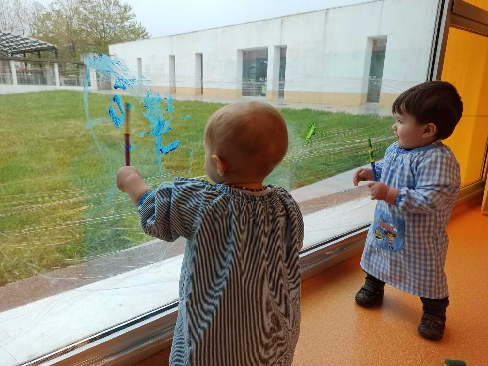 En esta ocasión os queremos enseñar una actividad plástica donde hemos pintado con pinceles sobre papel transparente pegado sobre las ventanas, creando así unas originales vidrieras de colores de forma cooperativa.