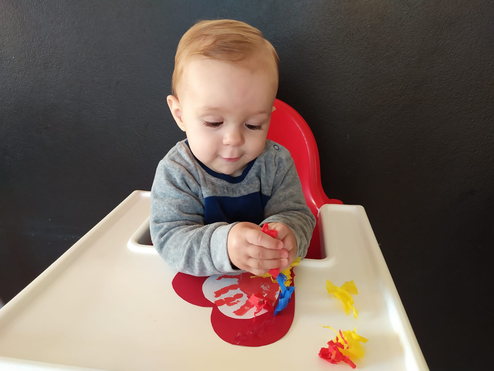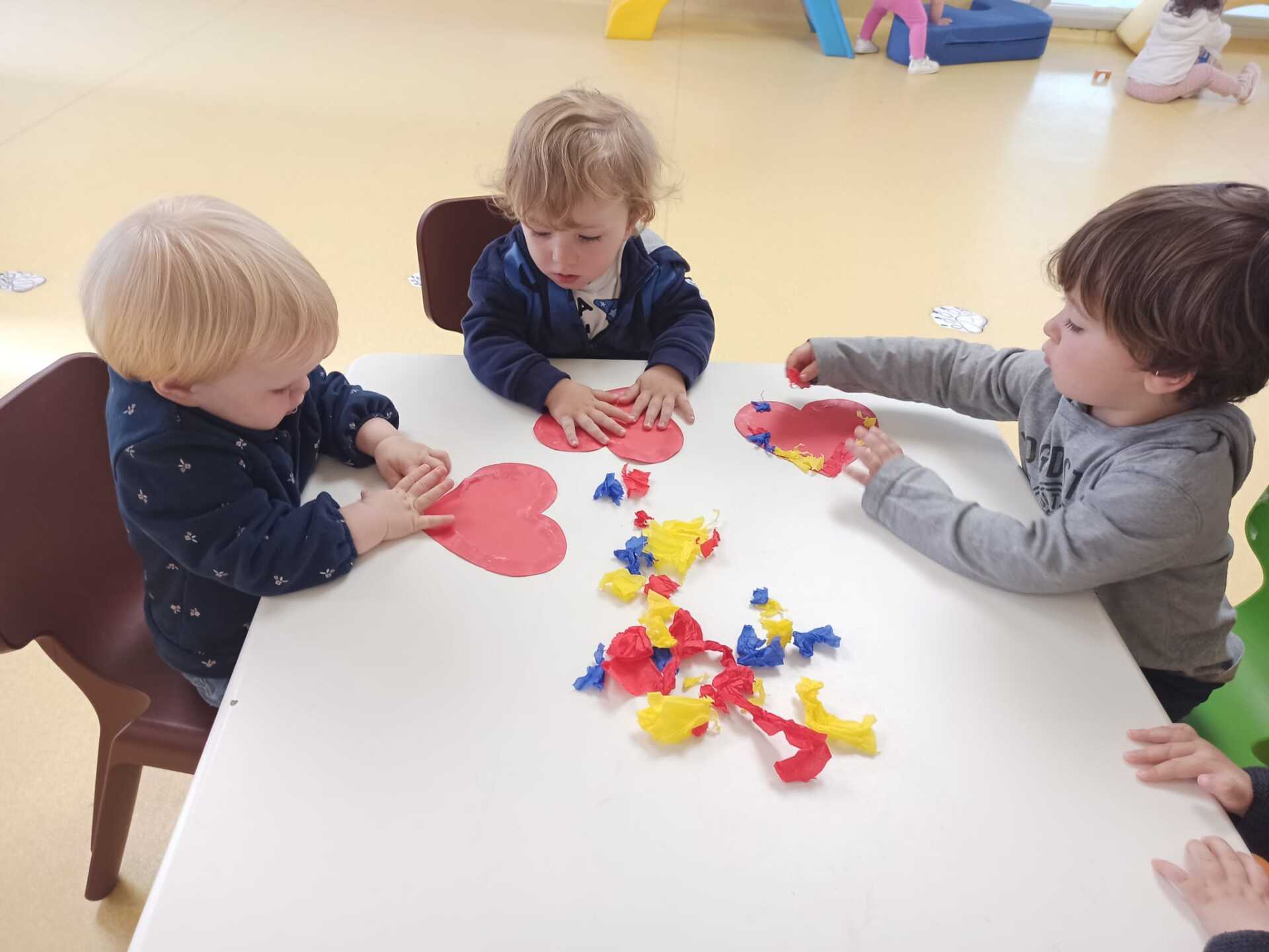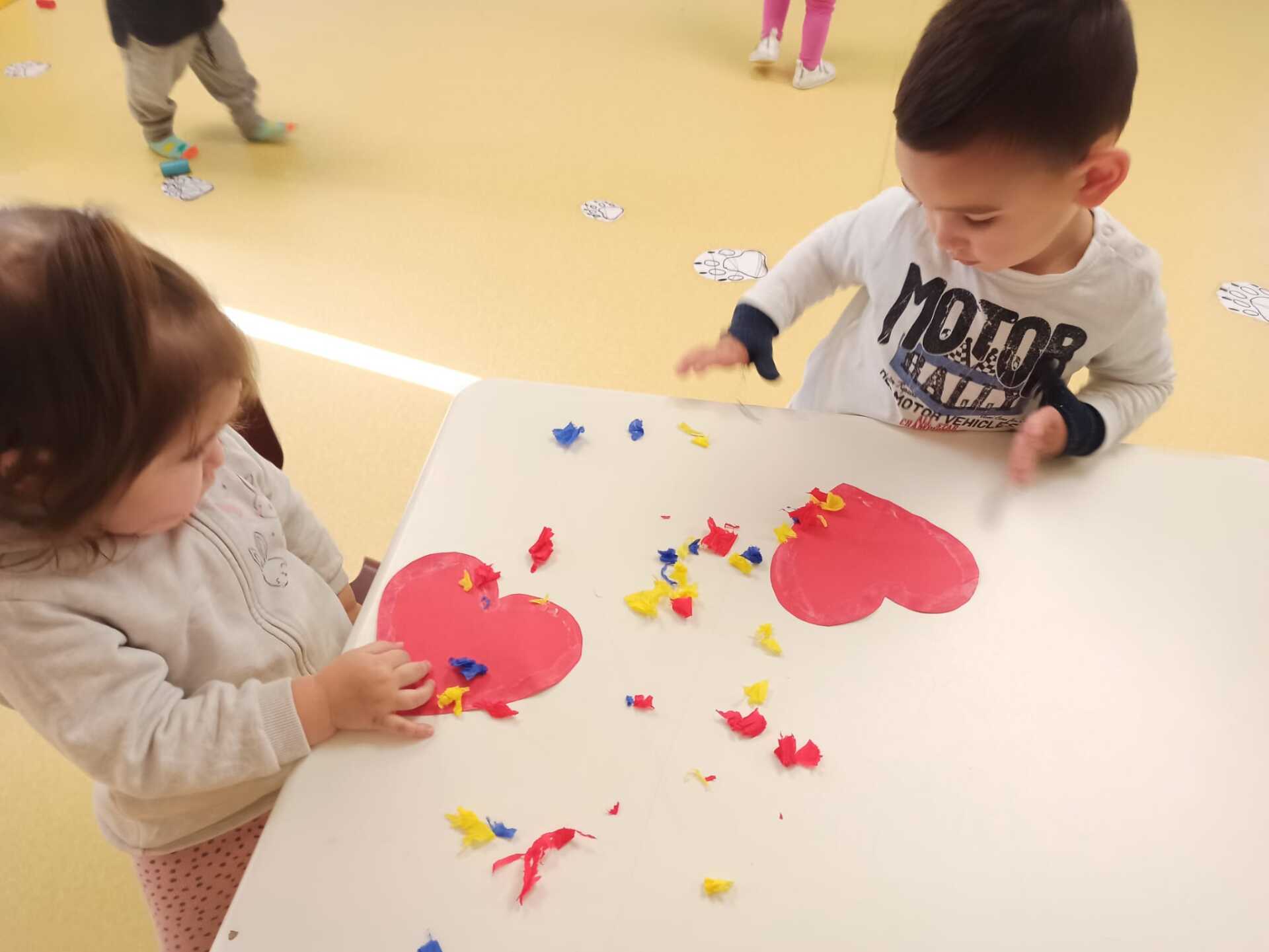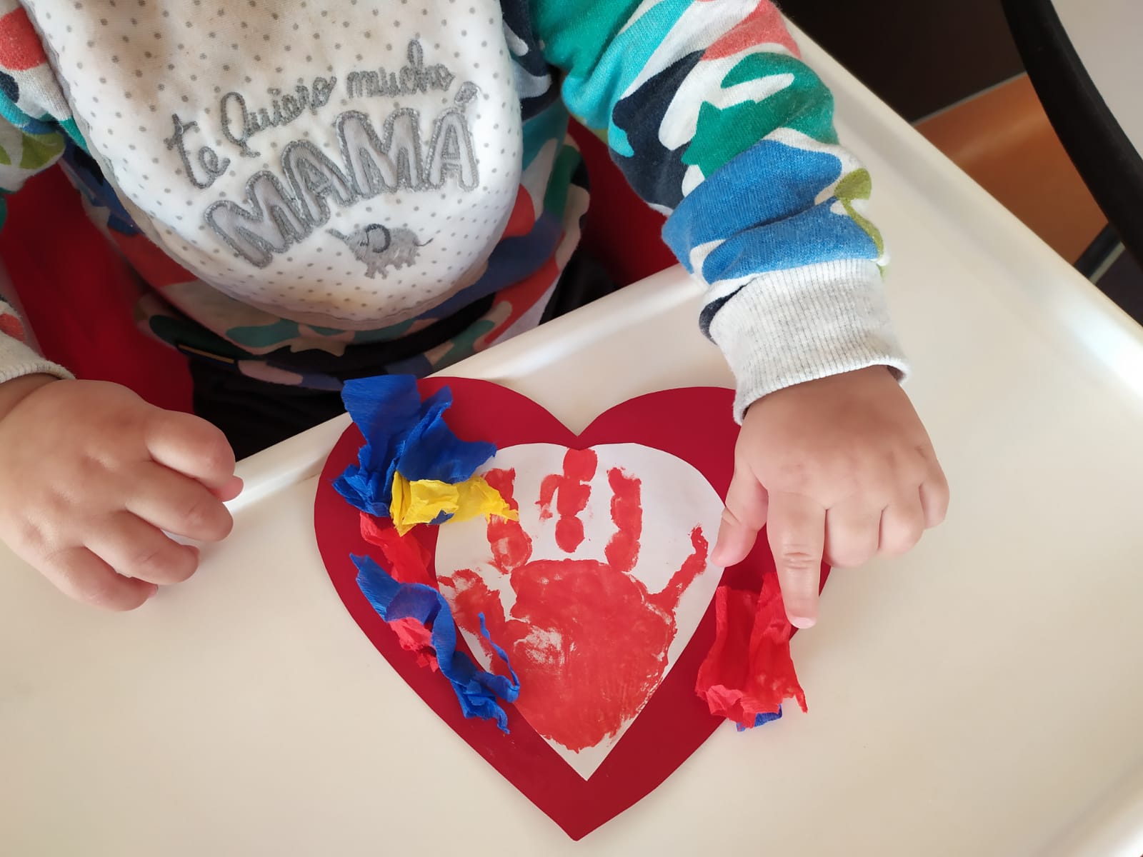 Esta semana hemos realizado una actividad muy especial. Hemos querido plasmar la huella de nuestras manos sobre un bonito corazón para todas nuestras mamás. Después lo hemos decorado rasgando papel de seda, trabajando a su vez nuestra motricidad fina, los colores y las texturas.