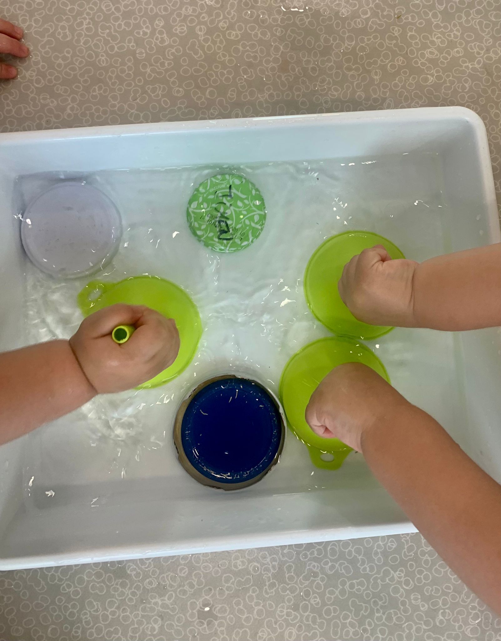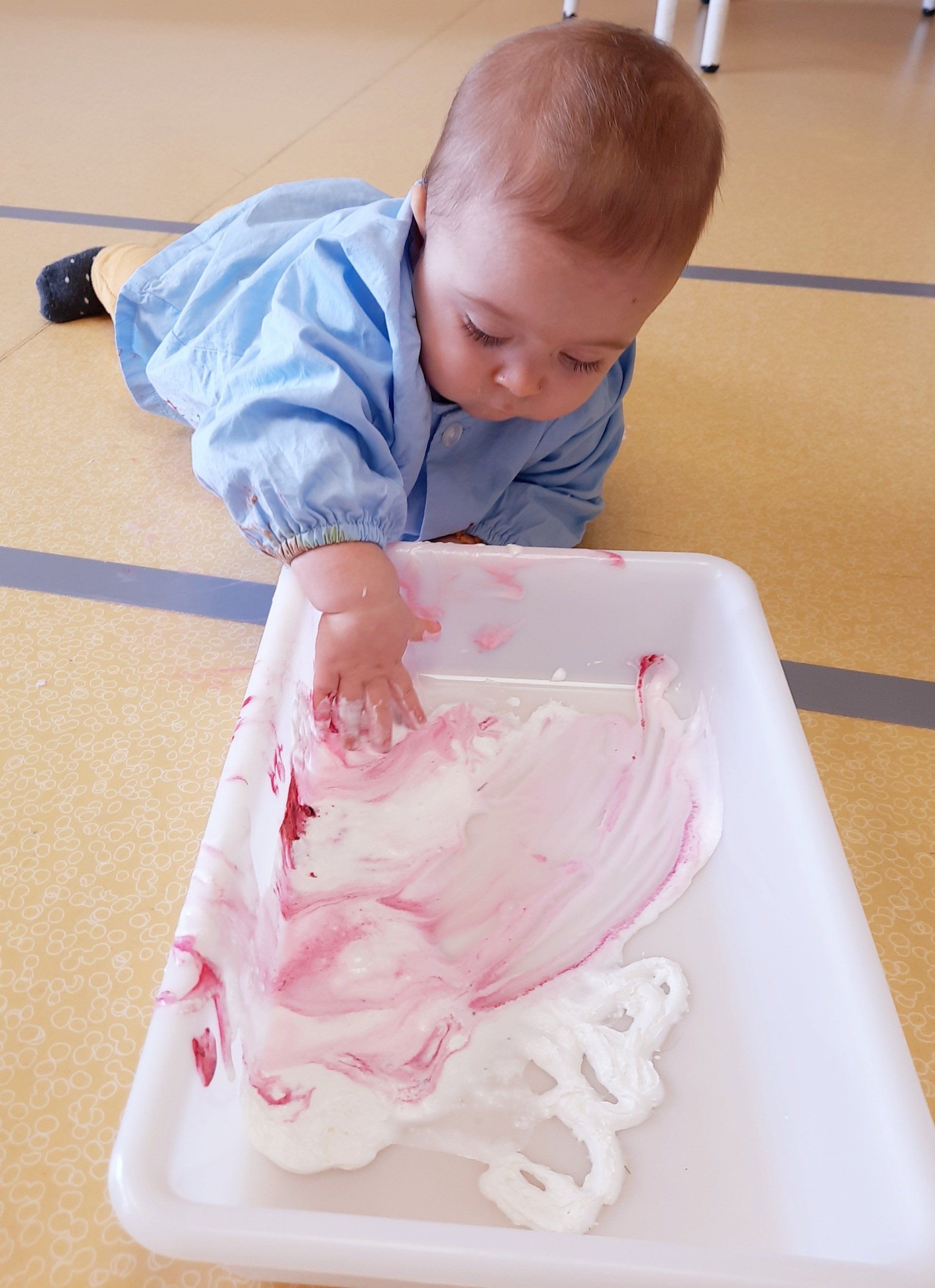 Les preparamos ¡bandejas sensoriales! llenas de nata montada y colorante alimentario.