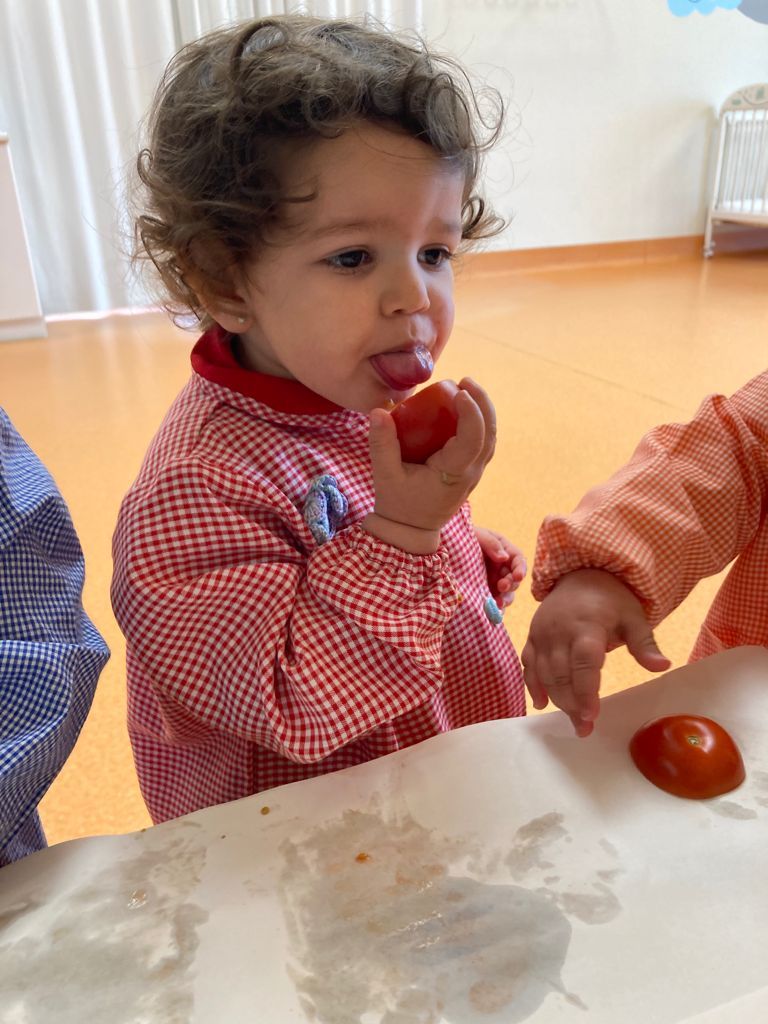 Como nos divertimos tanto pintando con zanahorias la semana pasada, esta vez hemos vuelto a desarrollar esta técnica tan llamativa para ellos, pero con tomates. Algunos han pintado, otros los han probado y también los han exprimido. Llevando a cabo este tipo de actividades podemos comprobar las diferentes reacciones que se producen en cada niño/a.
