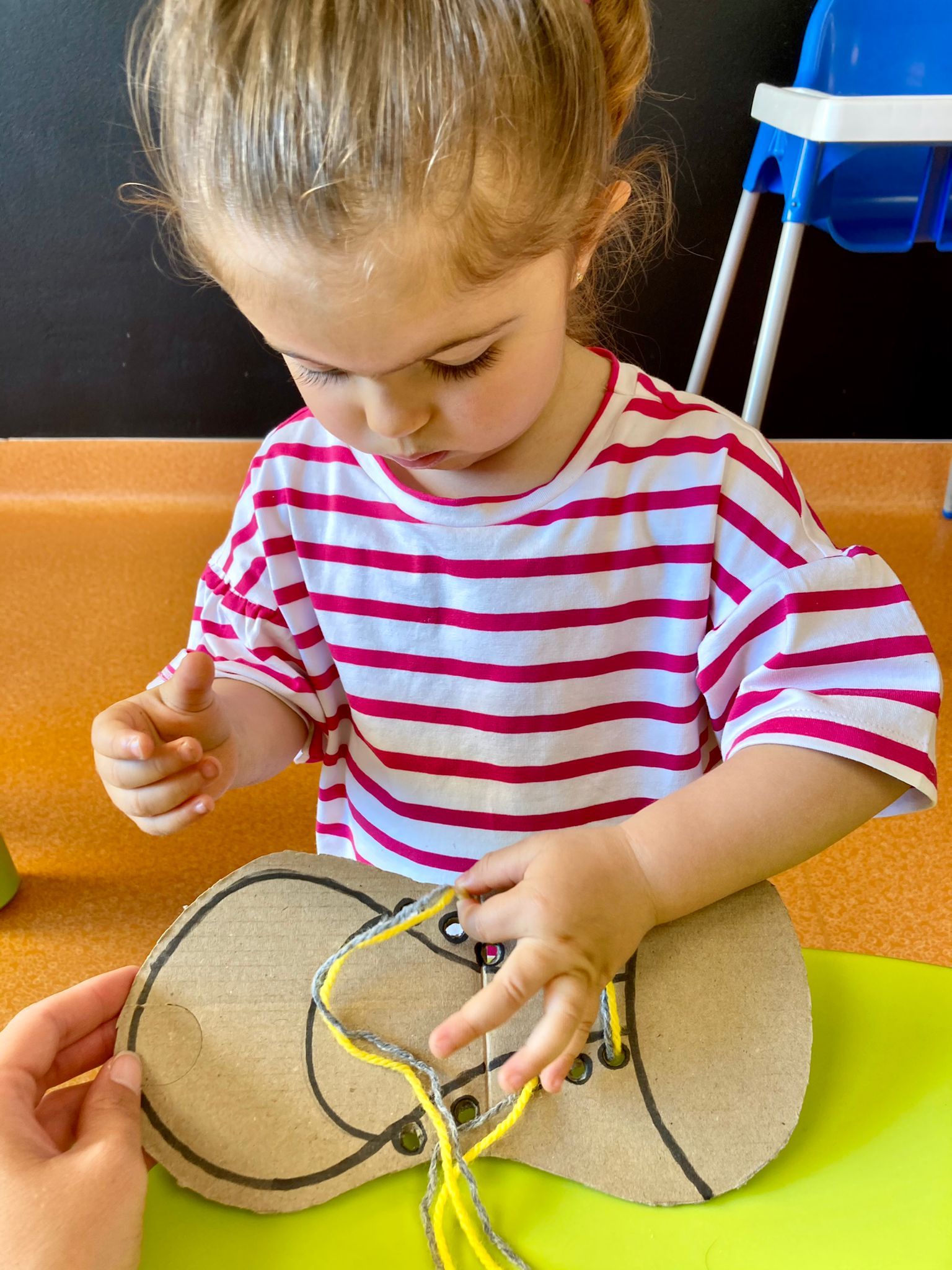 Esta semana hemos trabajado la psicomotricidad fina de una forma nueva y atractiva para los niños/as. Hemos realizado zapatos en cartón y los hemos coloreado y les hemos puesto unos cordones muy llamativos. Les ha gustado mucho desatar los cordones y meterlos en los agujeros. Además, sin darnos cuenta, hemos trabajado la coordinación óculo-manual y el movimiento pinza con nuestros dedos.
