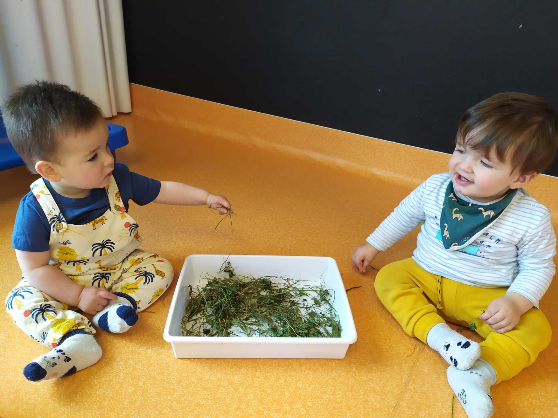 En esta ocasión os mostramos una actividad sensorial, la cual ha consistido en recoger en el jardín hierba y jugar con ella en bandejas de experimentación. Los niños y niñas han manipulado su textura y su olor, pudiendo trabajar tanto los sentidos como el entorno natural que nos rodea de una forma más directa y conectada con la realidad.