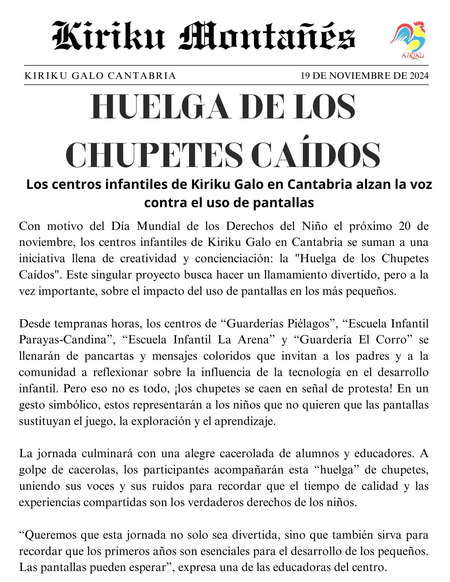 Desde los centros de Kiriku Galo en Cantabria (Guarderías Piélagos, Escuela Infantil Parayas-Candina, Guardería El Corro y Escuela Infantil La Arena), os presentamos esta noticia que refleja nuestra iniciativa para el Día Mundial de los Derechos de la Infancia. Un acto simbólico para concienciar sobre el uso de pantallas en los más pequeños.