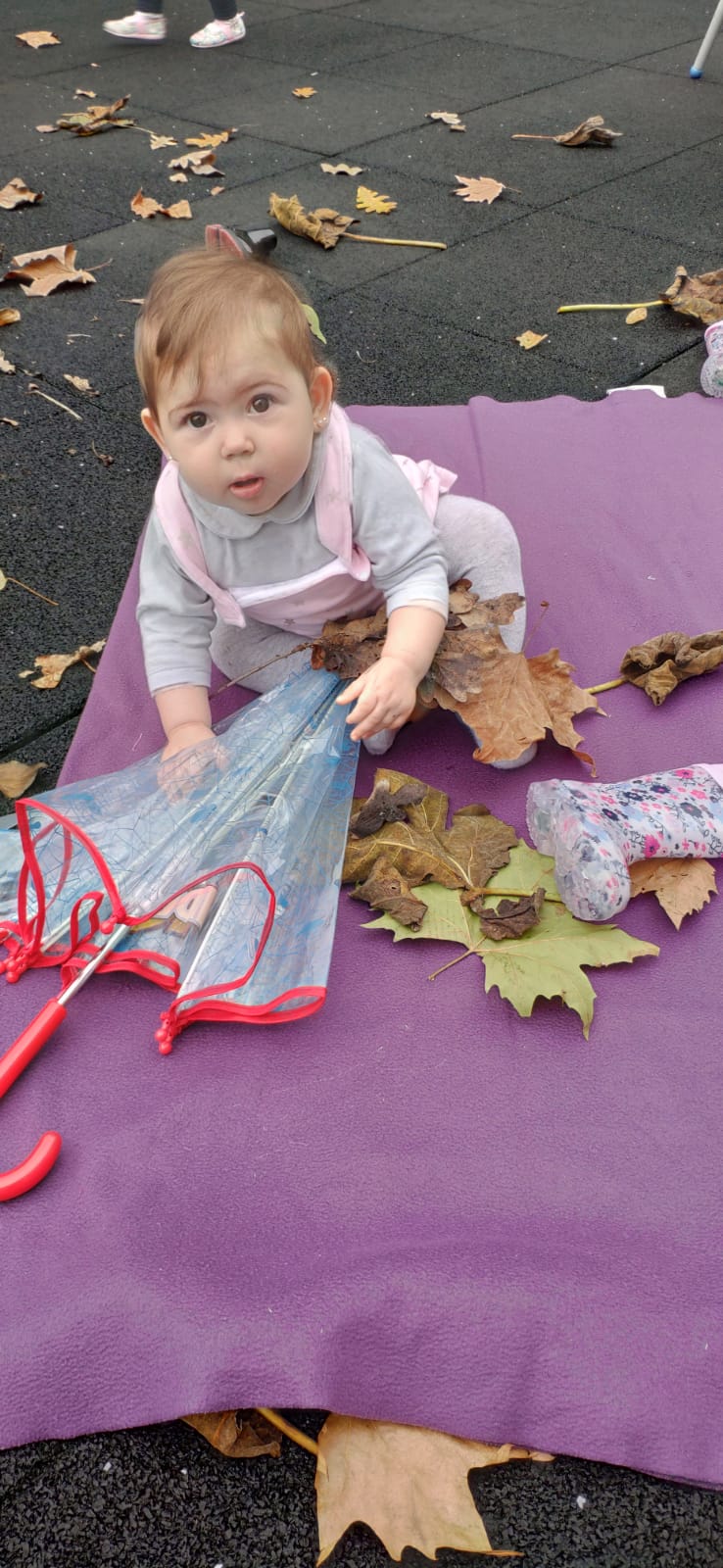 En esta instalación, hemos querido dar protagonismo al otoño, poniendo objetos característicos de dicha época como son las hojas secas, las botas de agua y los paraguas.