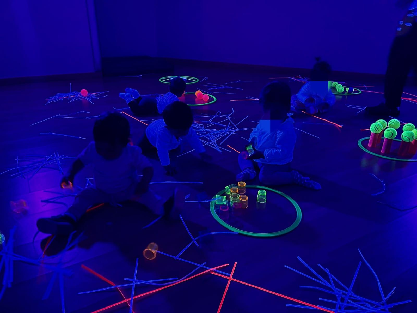 En el mes de abril hemos realizado una instalación con luz negra, un material nuevo que hemos incluido en nuestros centros. Los niños han disfrutado y han podido estimular el sentido de la vista con colores diferentes y novedosos para ellos.